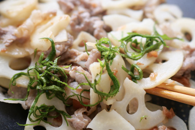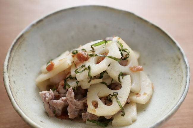 れんこんはいちょう切りにして水にさらします。梅干しは粗く刻み、しそはせん切りにしておきます。豚肉と水気を切ったれんこんをさっと炒め、煎り酒と梅肉を入れて全体に絡め、最後にしそを混ぜて出来上がり。