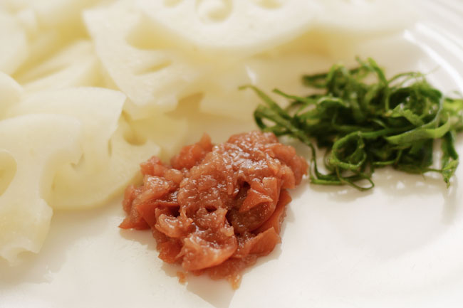 1./れんこんは皮をむいて、約5mmのいちょう切りにする。少し水にさらしたらザルに上げ、水気を切る。梅干しは種を取って粗く刻み、しそはせん切りにする。