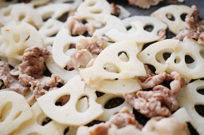 豚肉とれんこんを炒める
