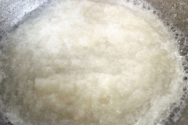 2./すりおろした梨とレモン汁を鍋に入れて中火にかけ、かき混ぜながらアクが出たら取りのぞく。