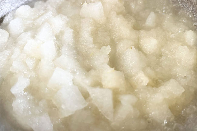 3./2に角切りの梨を入れ、弱火で15分程とろみがつくまで煮詰めれば出来上がり。