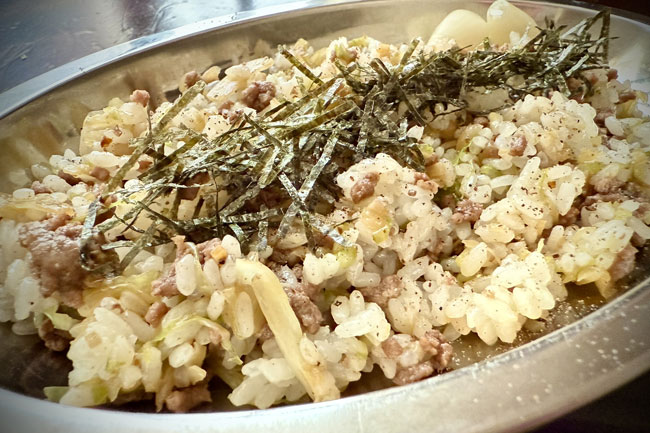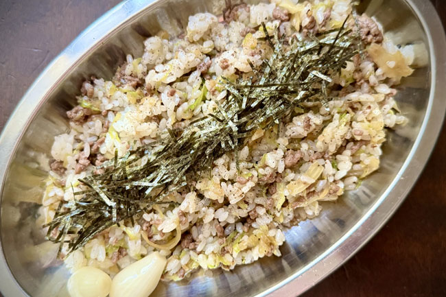 キャベツと牛ひき肉の旨みが重なりあった豊かな味わいの具材に、バターのコクと黒胡椒のアクセントが加わり、全体をまとめ、引き締めます。温かいごはんと混ざることで、満足感のある献立に仕上がります。箸休めとして、酸味のあるピクルス類をそえるのがおすすめで、今回はらっきょうを添えています。
