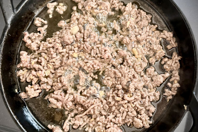 4./にんにくが淡いきつね色になってきたら、牛ひき肉を入れ、炒める。