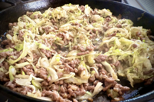 にんにくの香りを移したオリーヴオイルでキャベツと牛ひき肉を炒め、キャベツの甘みと牛ひき肉の旨みを重ねます。