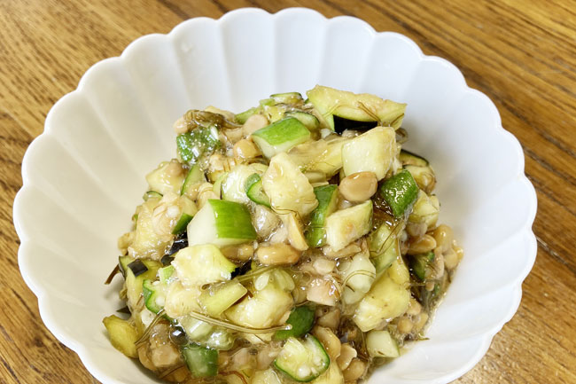 納豆は他の具材と混ざりやすいひきわりを使います。野菜はなすときゅうりは外せませんが、あとはオクラやみょうが、新生姜などお好みのものを合わせてください。