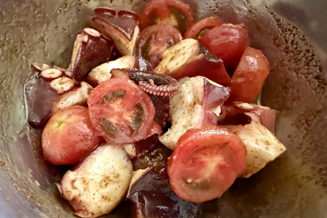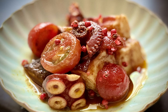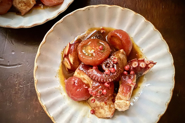 たことフレッシュトマトを、スモークパプリカの香りとともにマリネします。