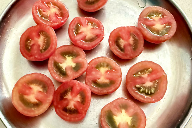 2./ミニトマトを湯剥きし、半分に切る。