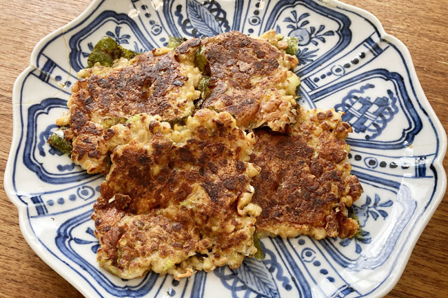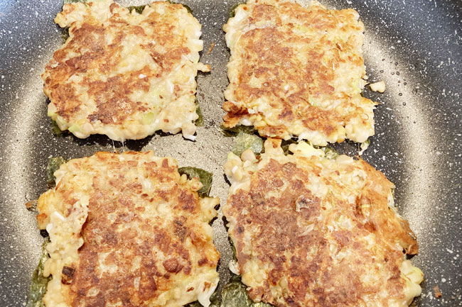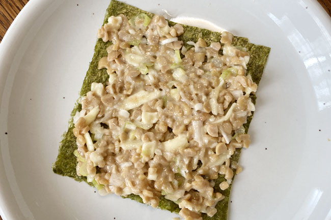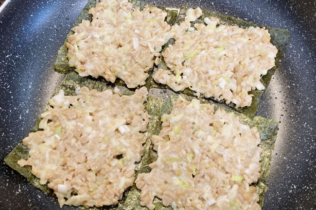 納豆とチーズを混ぜたら片栗粉でつなぎ、海苔にのせてフライパンで焼くだけです。納豆はひきわりのほうが混ざりやすくまとまりやすいので上手にできます。