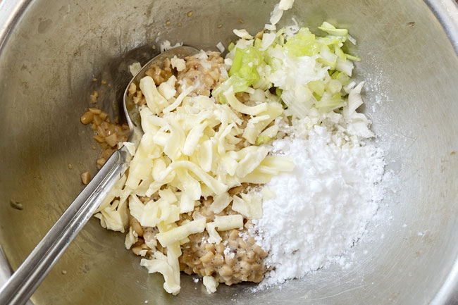 2./1に溶けるチーズ、片栗粉、長ねぎ、納豆パックについている醤油を入れてさらによく混ぜる。
