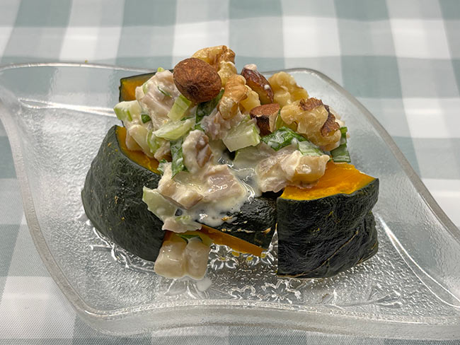 5./器にカボチャをもって、4であわせたいぶりがっこマヨドレッシングをかけナッツをのせて出来上がり。