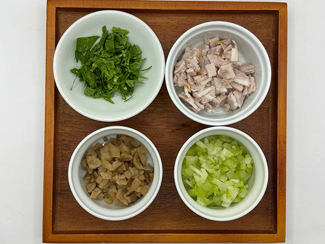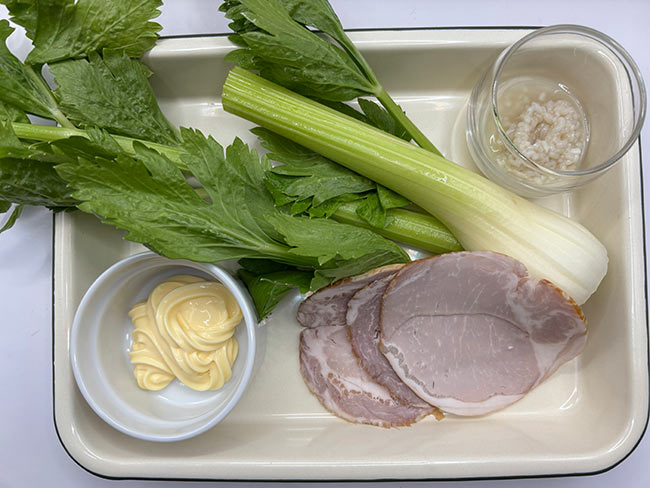3./いぶりがっこ・セロリ・セロリの葉・ハムをそれぞれ粗みじんに切る。