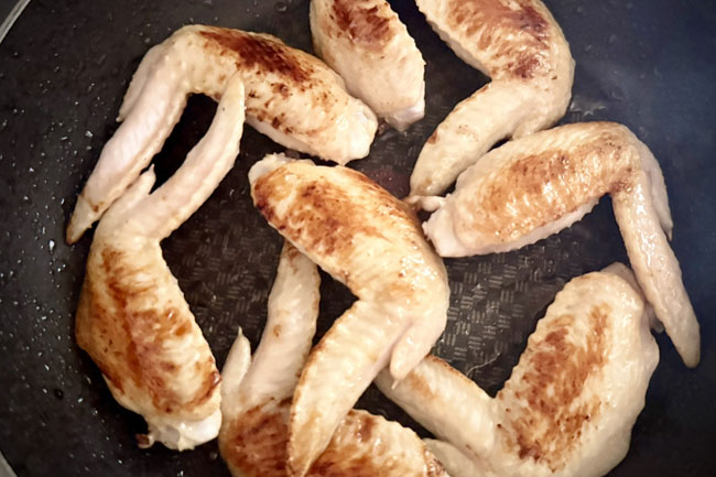 5./フライパンに油を少々入れ、手羽先の両面に焼き目をつけ、バットに取り出す。