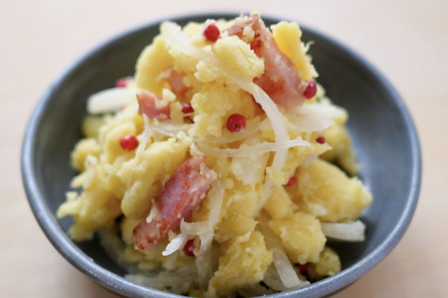 華やかな香りと鮮やかな色が特徴のピンクペッパーをアクセントにしたさつまいものサラダです。さつまいもは完全につぶさず、ホクホク感と甘みが味わえます。さらし玉ねぎと、香ばしく焼いたベーコンもたっぷり入れます。