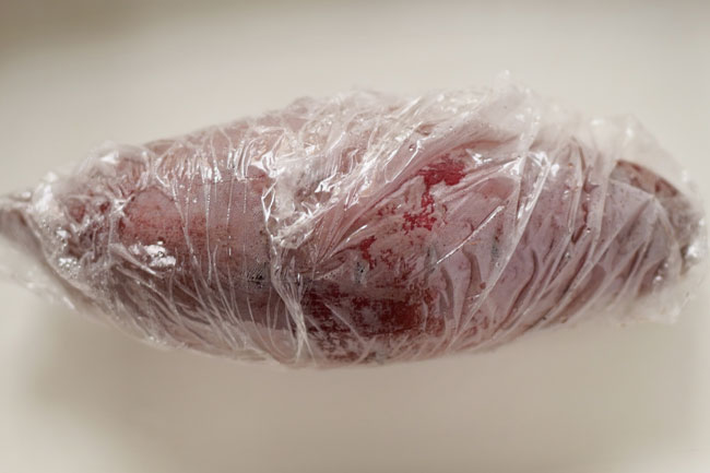 1./さつまいもは洗ってラップでくるみ、電子レンジで8分ほど中まで加熱する。