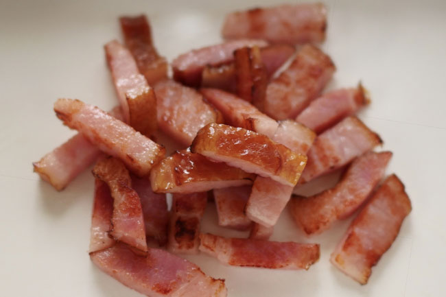 2./玉ねぎは薄切りにして水にさらす。ベーコンは細切りにして炒め、表面をカリッとさせる。