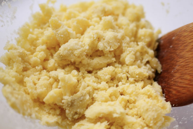 3./1の皮をむいて粗めにつぶし、熱いうちに塩をする。