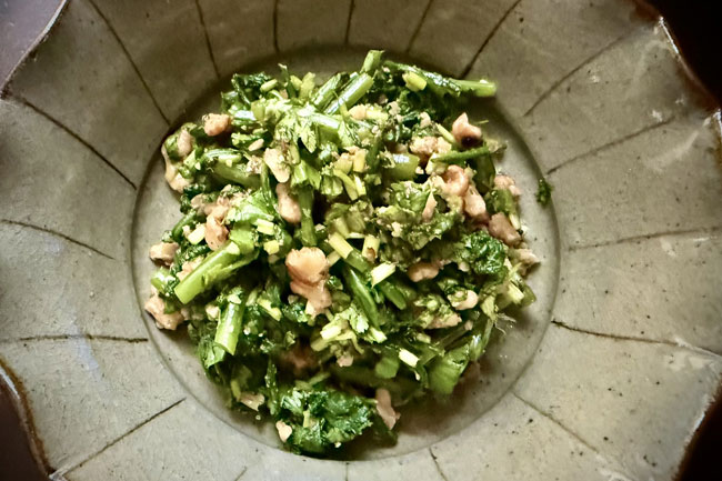 葉の姿が菊に似ていることから「菊菜」と呼ばれ、地域によっては春に花を咲かせることから「春菊」とも呼ばれています。独特の香りとほろ苦さが、食卓に季節の彩りを添えてくれる食材です。今回のような醤油をきかせた和えもののほか、すき焼きの具材としてもポピュラーで、濃いめの味わいの料理と合わせることで、そのほろ苦さと香りが美味しいバランスを生み出します。菊菜の味わいの中にパクチーの青い香りが、全体をきゅっと引き締めています。