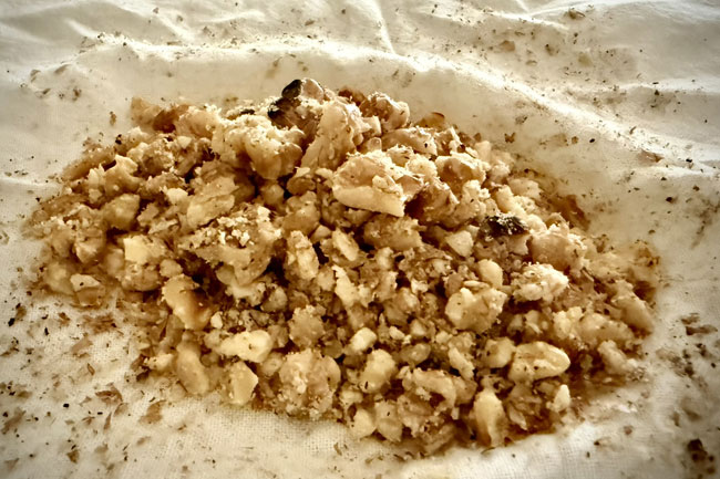 4./胡桃を布巾でつつみ、麺棒などで布巾の外側から胡桃を叩き、くだく。
