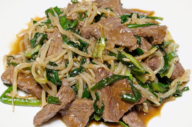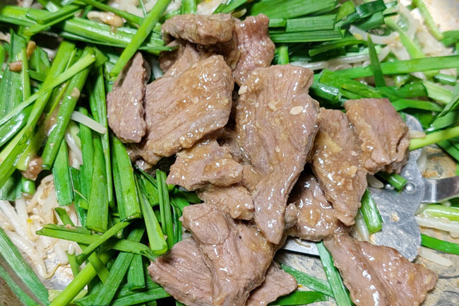 7./モヤシとニラ茎に火が通ったら、ニラの葉と5の鹿肉を入れて、炒める。