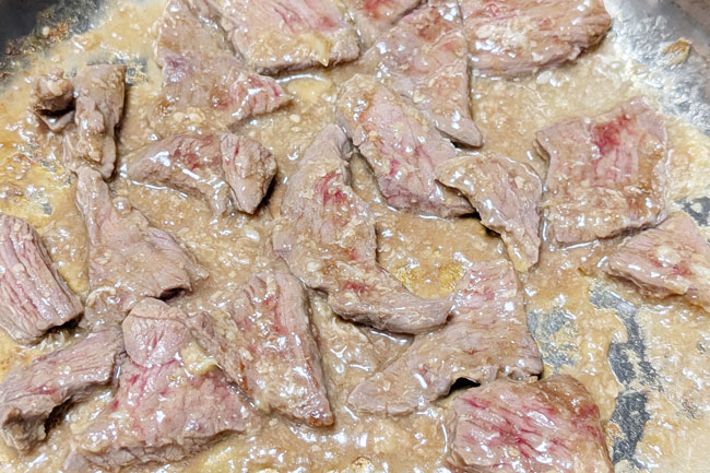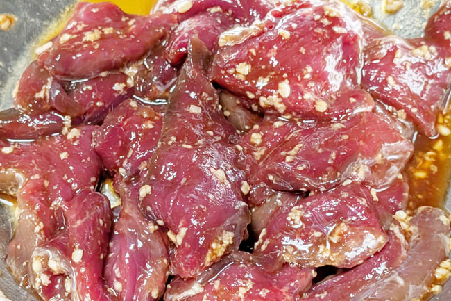 3./フライパンにサラダ油を入れ、おろしショウガとおろしニンニクを入れて中火にかけ、香りがたったら、2の鹿肉を炒める。
