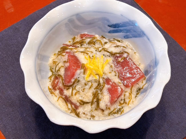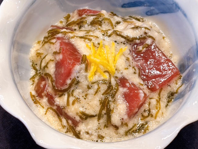 長芋のすり潰したものにもずくを合わせることで、潮の香りのとろろ和えにもなります。柚子の果汁と皮でビタミンもプラスして、味の深みを楽しむとろろ和え。炊き立てご飯と丼にしても美味しいので、ぜひお試しください!