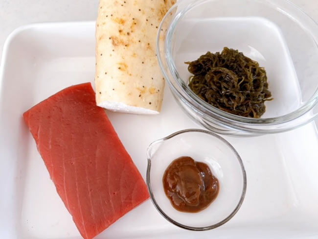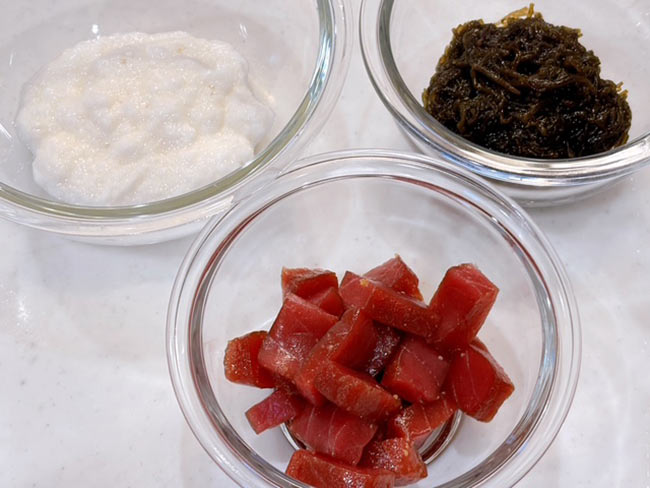 鮪を漬けにしてとろろ芋で和えるひとしな。今回は、醤油麹で鮪を漬けにすることで、旨味とコクが増します。