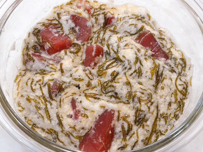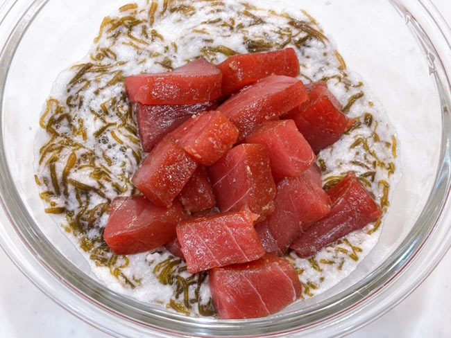 5./1で漬けにしておいた鮪は、表面の醤油麹をキッチンペーパーで軽く拭き取り、ひと口大に切り、4に加えてよく和える。最後に味をみて、醤油で調整する。