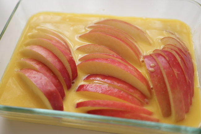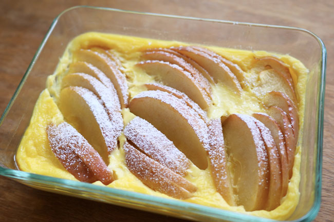 りんごスライスを耐熱容器に並べます。卵を割りほぐし、甘酒、薄力粉をよく混ぜて、耐熱容器に注ぎます。180℃に余熱したオーブンで30〜40分焼いて出来上がり。お好みで粉砂糖をふります。