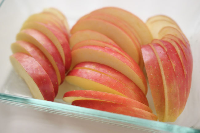 1./オーブンを180℃に余熱する。りんごは芯を取り、薄切りにして耐熱容器に並べる。