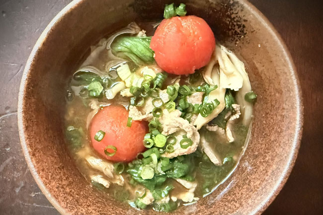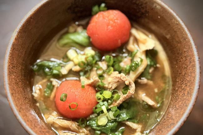 トマトの酸味とレタスのほろ苦さ、味噌のコクが調和した豚汁はさわやかな味わいです。ほどよい酸味が後味を軽やかにしてくれ、定番メニューの豚汁が、最後のひと口までフレッシュに楽しめます。
