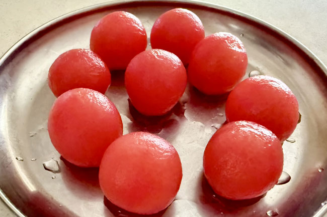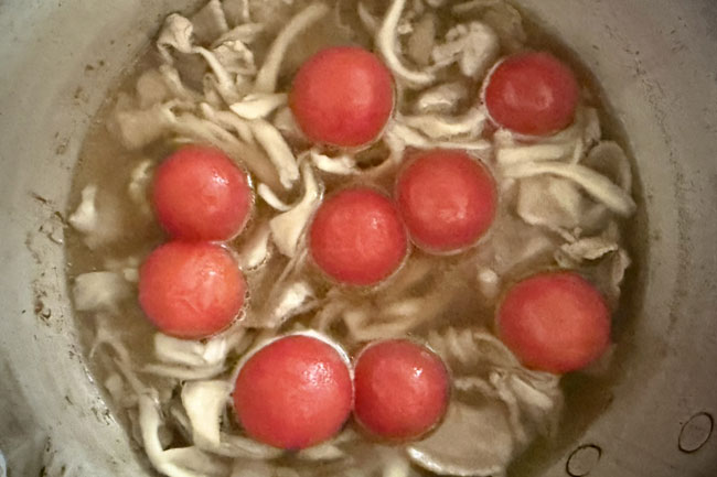 8./数分したのち、味噌を溶き入れ、湯むきしたプチトマト、おろした生姜を搾り(露生姜)、仕上げにみりんをたらして火を止める。そこにレタスを入れて混ぜる。器に盛り付け、青ねぎを散らして出来上がり。