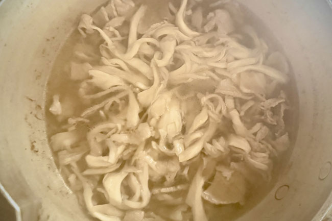 6./鍋にごま油を入れ、豚肉を炒め、粗方火が入ったら、日本酒をまわしがける。続いて舞茸を加えてさらに炒め、出汁を注いで煮立たせ、アクを取る。