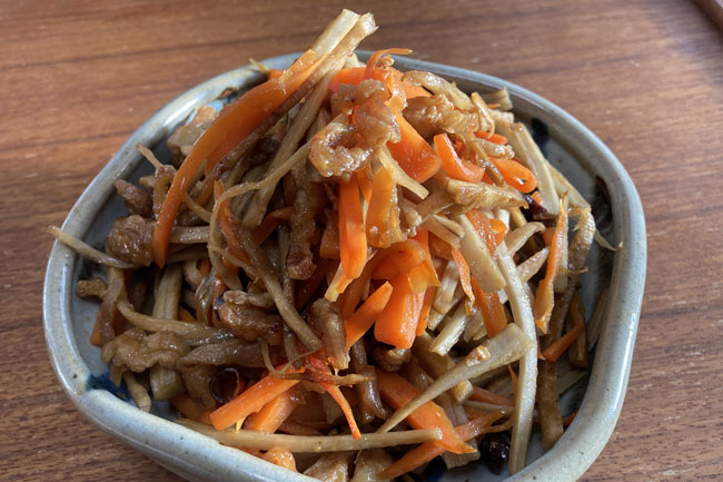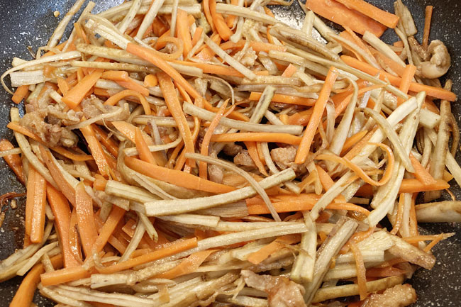 今回は人参を多めに使って甘さを出しています。炒めるだけで煮ないので、ごぼうも人参も食感はシャキシャキです。