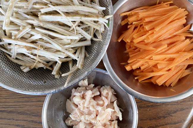 1./ごぼうは皮をむいて千切りにし、水に10分程度さらしてからザルに上げておく。