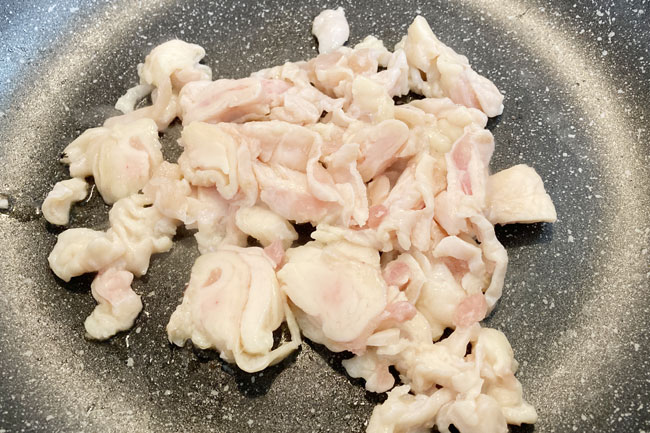 3./鶏皮を細切りにする。フライパンを熱し、弱火で鶏皮から脂が出てカリっとするまでじっくり加熱する。