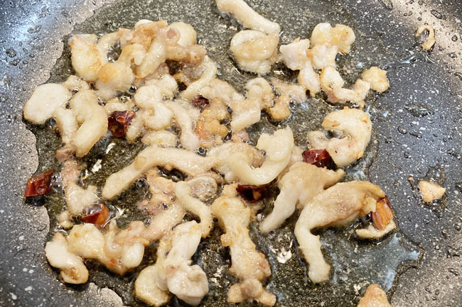 4./3で出た脂の量が多ければ少し捨て、鷹の爪を入れて少し炒めて辛味を出し、そこに1と2を入れて中火で炒める。