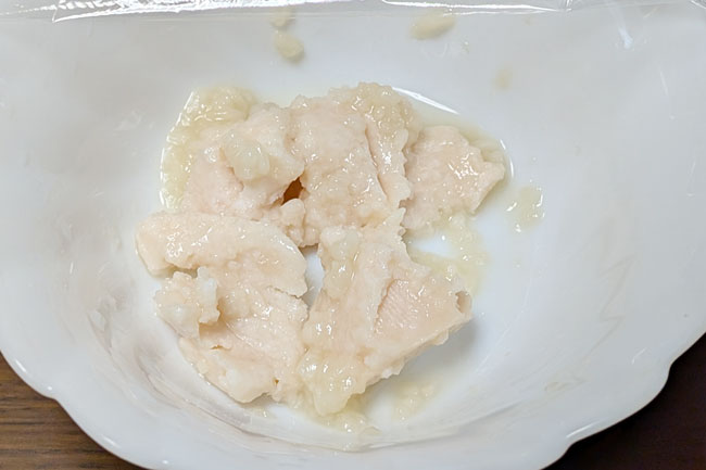 酒粕と塩麹を電子レンジで加熱すると、酒粕が柔らかくなり、後の作業がやりやすくなります。つなぎの片栗粉や卵は使いません。味つけは塩麹とショウガと少量のしょうゆだけで十分です。