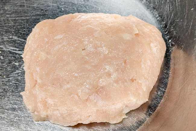 2./ボウルに鶏ひき肉を入れ、よくこねる。粘りが出て、一つにまとまるまでこねる。