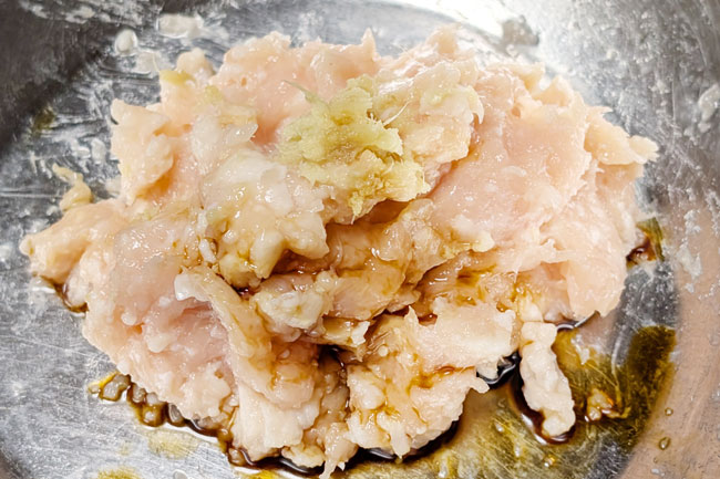 4./すりおろしショウガとしょうゆを入れ、よく混ぜる。