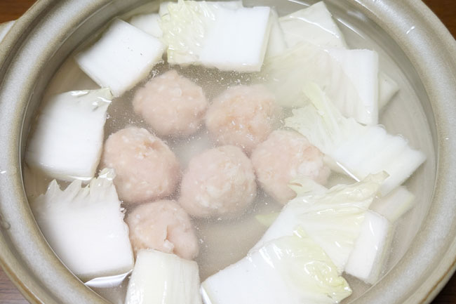 1./鶏ひき肉団子と白菜の芯を、水600mlでアクをとりながらゆでる。白菜の芯が柔らかくなるころには、鶏ひき肉団子の中まで火が通っている。