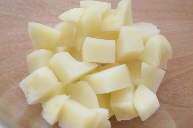 2./じゃがいもは皮をむいてサイコロに切り、耐熱容器に入れてラップをして電子レンジで約4〜5分加熱する。