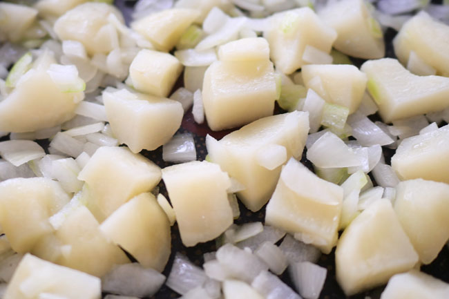 3./玉ねぎは粗みじんにする。オリーブ油をフライパンで温め、玉ねぎを炒める。透明になってきたらじゃがいもを加えて炒め、ボウルに取って塩麹を混ぜる。