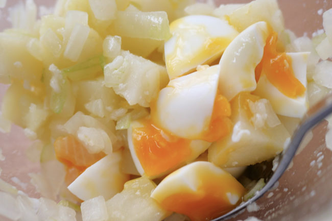 卵は8分くらいの半熟卵にします。じゃがいもはサイコロにして、やや硬めに電子レンジで加熱します。玉ねぎは粗みじんにして、オリーブ油で炒めます。透き通ってきたらじゃがいもも加えて炒めます。火が通り過ぎる前にボウルに取り、塩麹を混ぜます。半熟卵も殻をむいて6つに切って加え、お好みでドライパセリを振って出来上がり。