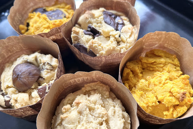 今回は基本のマフィンに、チョコレートや旬の栗やかぼちゃも混ぜて作りました。