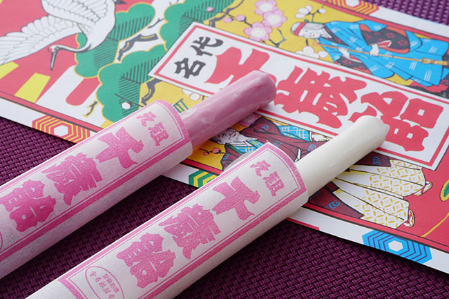 水飴と砂糖を煮詰めて、何回も引いては延ばし、気泡を入れて棒状に作る細長い飴で、縁起の良い絵が描かれた袋に、紅白の二本が入っている。
