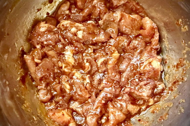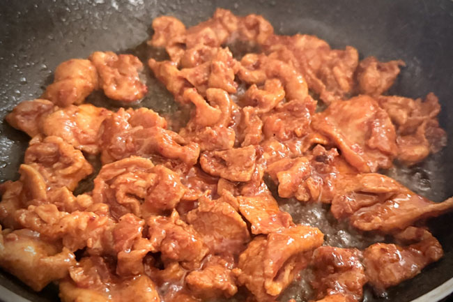 6./フライパンを温め、マリネした豚肉を強火で炒める。