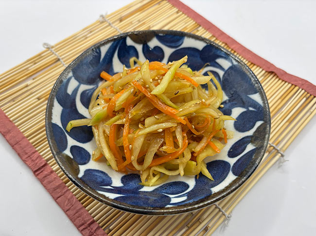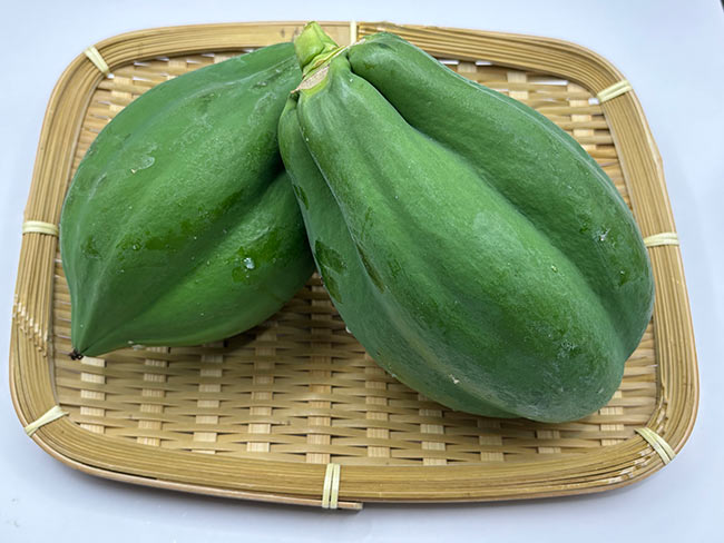 最近は温暖化のせいか、沖縄で栽培されていた野菜が本州でも作られるようになってきました。今年は長野県の道の駅でも青パパイヤを見かけました。なかなか馴染みの少ない野菜だと思いますが、栄養豊富で生食・炒め物・煮物・揚げ物と調理方法も多彩です。今回は山梨県産の青パパイヤを使い食感を生かしてサッパリいただけるナムルにしてみました。