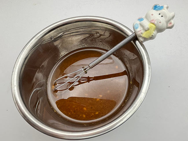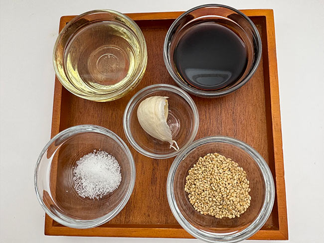 5./ボウルにゴマ油・醤油・塩・おろしニンニクを入れてよく合わせる。
