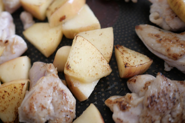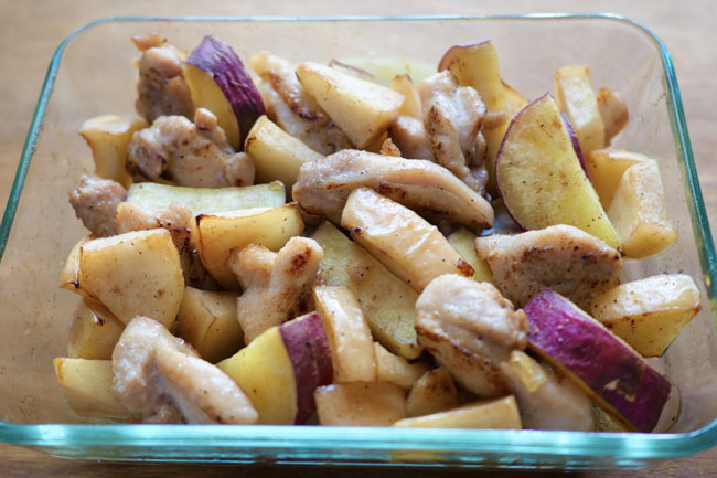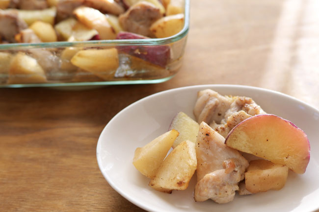 鶏肉は塩こしょうをもみ込んだら、りんごと漬け込みます。オーブンで焼く前にフライパンで表面を焼いて香ばしくします。鶏肉を入れるときになるべく皮目を下にして焼くといいでしょう。さつまいももさっと焼いておきます。あとはオーブンでじっくり中まで火を通して出来上がり。