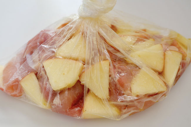 1./りんごの芯を取って厚めのいちょう切りにする。鶏肉は食べやすい大きさに切り分けて、塩、こうしょうをもみ込み、りんごとともにポリ袋に入れる。空気を抜いて冷蔵庫で3時間〜半日おく。